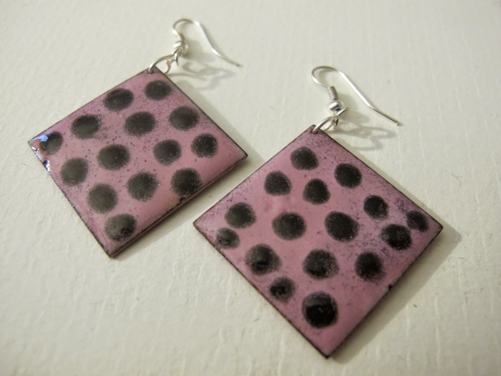 On the positive side, I now know a color combination which looks really good and I plan to make another piece using those pastel stripes. Plus, I DID manage to successfully complete a pair of pink and black heart and polka dot enamel earrings: